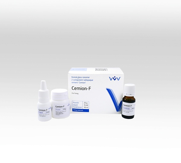 El cemento de ionomero de vidrio "Cemion-F" se forma durante la mezcla de los polvos y el líquido. Los polvos constituyen un afinado vidrio de silicato alumino-fluoro el cristal, el líquido - la solución de agua del poliácido acrílico.