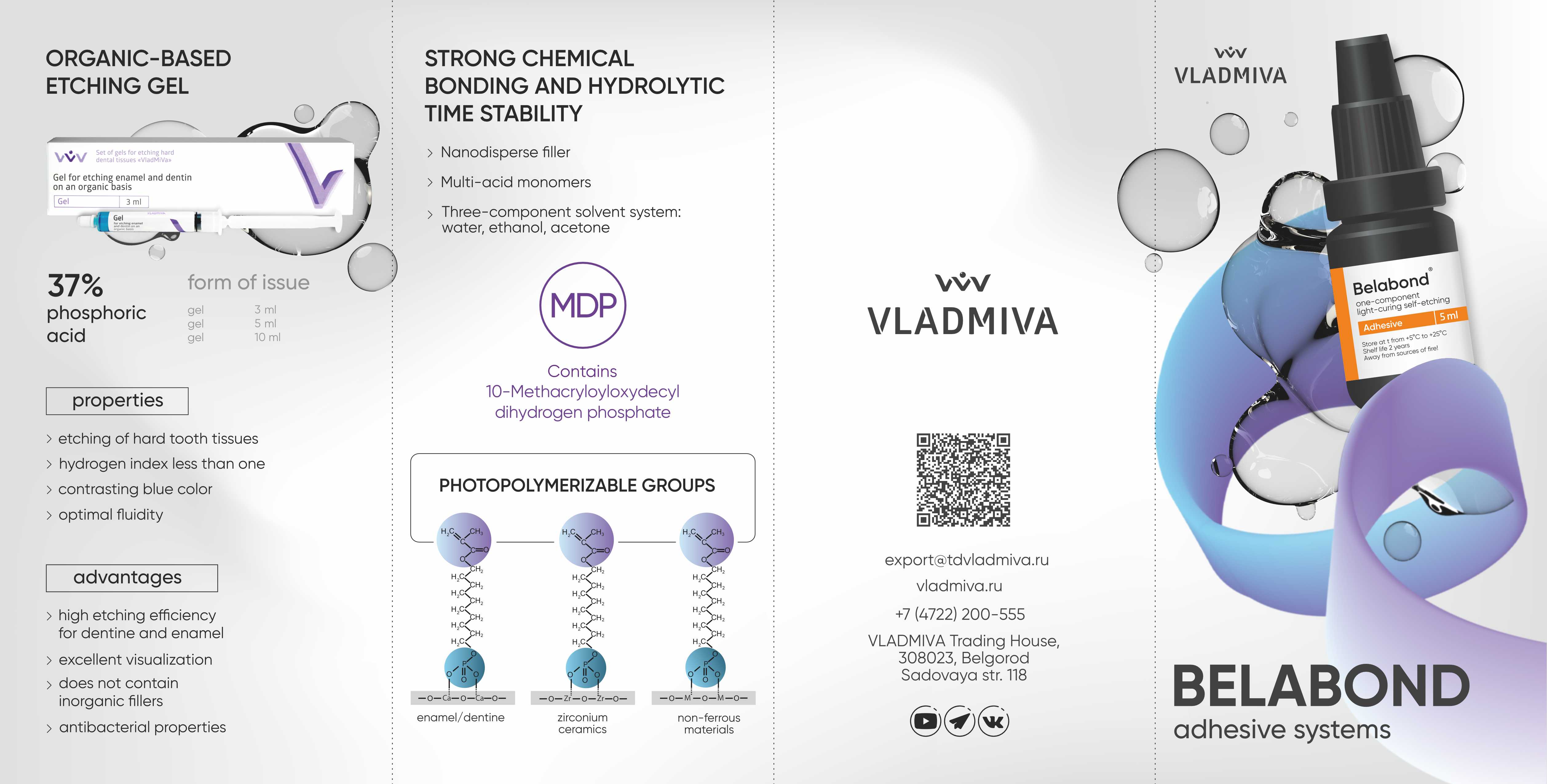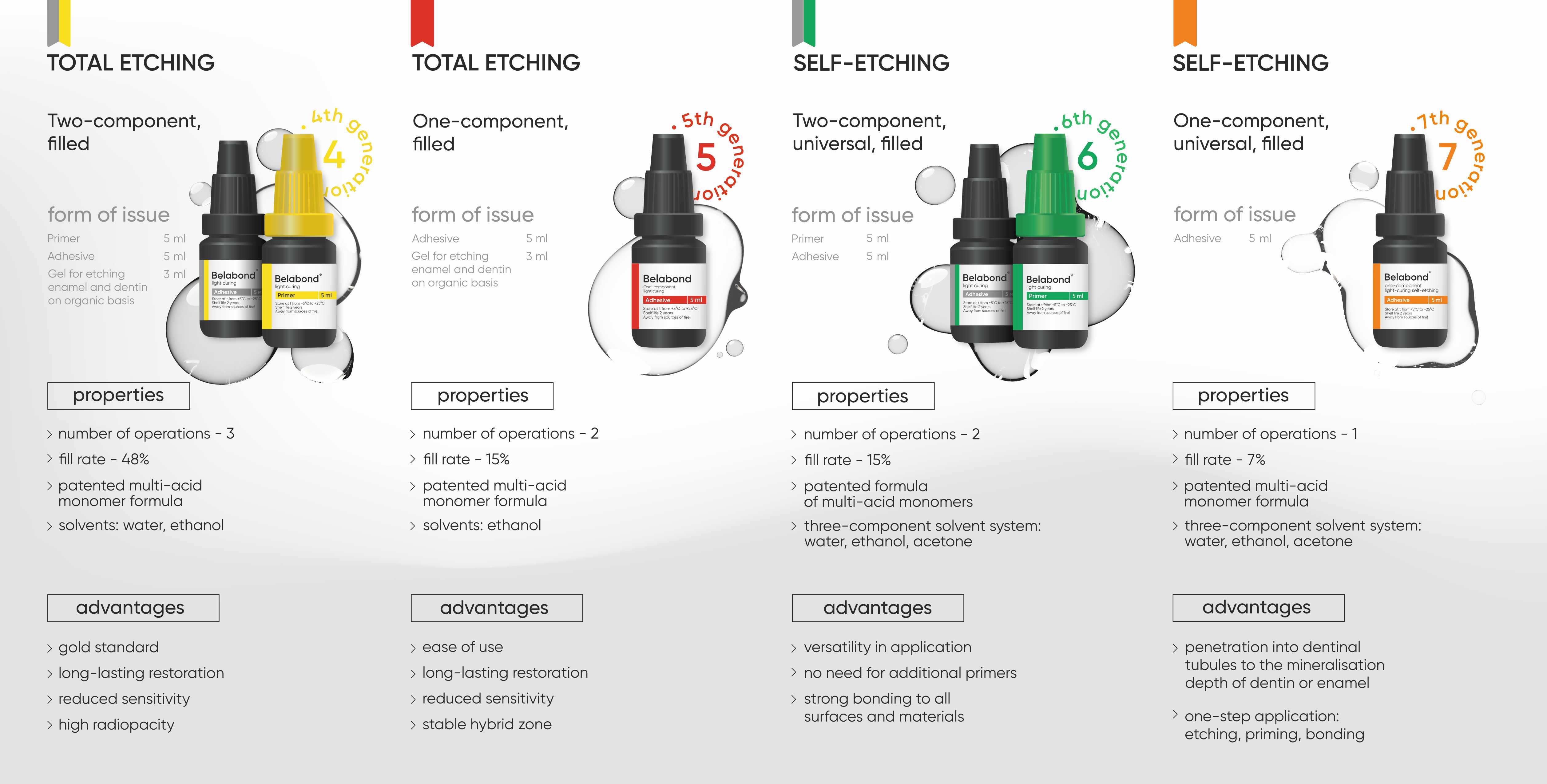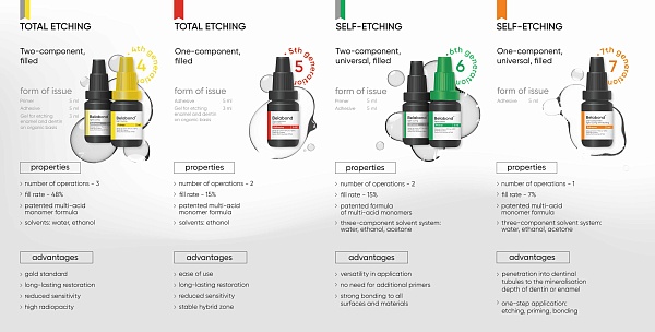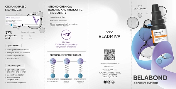 El adhesivo monocomponente autograbante y fotopolimerizable "Belabond" contiene oligómeros de metacrilato multifuncionales (Bis-GMA, UDMA, TEGDMA, HEMA, etc.), una composición del 7 % de dióxido de silicio coloidal modificado, monómeros ácidos adhesivos polimerizables mono y multifuncionales resistentes a la hidrólisis, activadores de polimerización, estabilizadores y un sistema de disolventes de tres componentes. El relleno fino promueve la formación de una película delgada durante una sola aplicación del adhesivo, proporciona un alto nivel de protección contra la microfiltración, mejora las propiedades mecánicas y reológicas y reduce la contracción de polimerización.