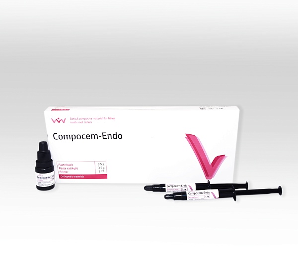 El material "Compocem-Endo" es un fluido radiopaco en base a multifuncional oligómeros metacrílico y nanoestructurados hidroxiapatita, se reelacionan a los materiales del mecanismo de doble curación (químico y de luz) y es producido en forma de dos pastas (básico y catalítico). El Tiempo laboral del material compone 10-15 minutos. El tiempo de curación del material de 15-20 minutos con la temperatura de más 37˚С.