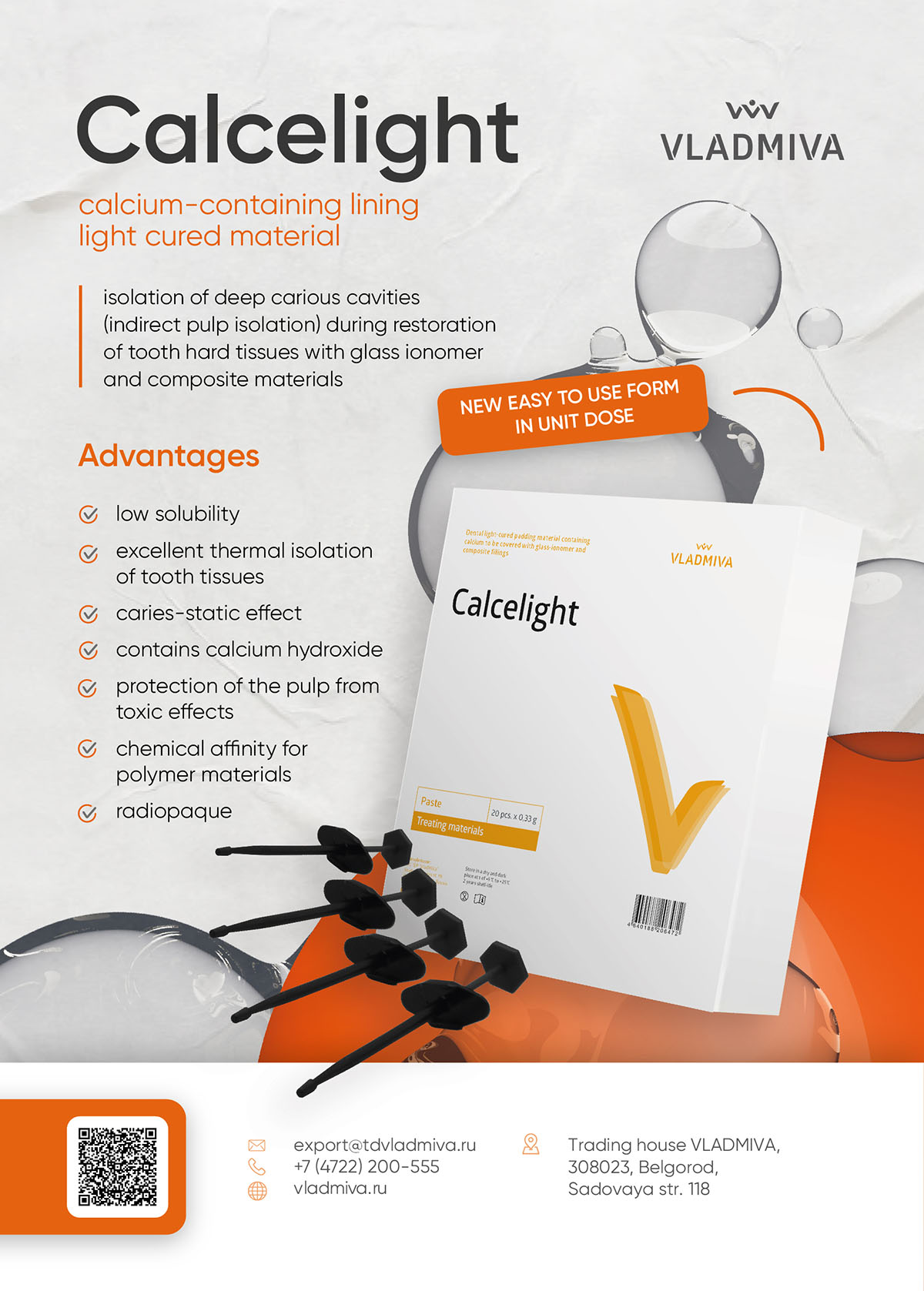 "Calcelight" es un compuesto de fotocurado de un solo componente, material de revestimiento radioopaco que contiene en su composición hidróxido de calcio, un aglutinante polimérico (oligocarbonato metacrilato), relleno radiopaco, iniciadores y activadores de la fotopolimerización.
