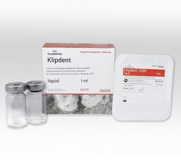 El biomaterial "Klipdent-Cem" abastece el contacto denso entre el hueso y la superficie del injerto dental, contribuye a la formación del nuevo autólogoal del tejido óseo, también obstaculiza el arraigo de las telas suaves, siendo la sustitución eficaz de la combinación tradicional «el material-membrana granulado».
