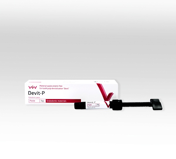 «Devit-P» dough is used for pulp devitalization and milk teeth mummification, when pulp extirpation can be exclude