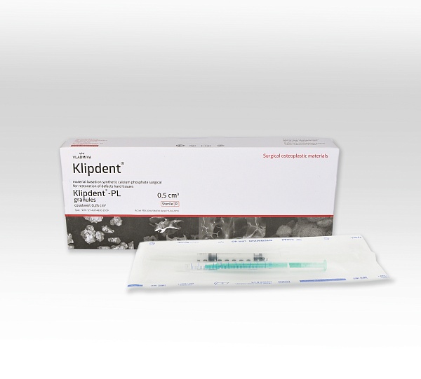 Osteoconductive material “Klipdent”-PL cosolvent consists of granules ß-tricalcium phosphate (ß-TCP) coated with a thin shell of biodegradable copolymer polylactideglycolide and the cosolvent. After mixing the granules with the cosolvent, the granules stick together, forming a plastic material with a high micro-and intergranular porosity, which can be introduced into the bone defect directly from the syringe. By contact with blood or oral fluid material takes the form of a bone defect, which provides stability to the defect and facilitates the procedure of suturing the wound. Biomaterial completely resorbed within 9-15 months. Resorption takes place parallel to the regeneration of bone tissue.