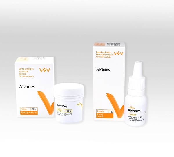 «Alvanes» powder is used as a hemostatic when removing calculus, curetting parodontal pockets, leveling alveolar processes and treating tooth sockets. It is also used in case of gingivactomy and after moulding.