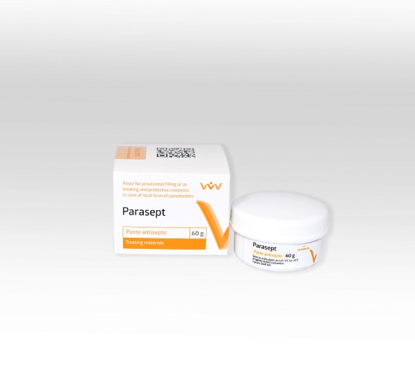 Material "Parasept" antiséptico es una pasta suave y sin eugenol, cemento a base de polvo y fibra de relleno y biocompatible y relleno de fibra. El efecto terapéutico El debido a la presencia en su composición de metronidazol activo ontra las bacterias anaeróbicas Gram-positivas y Gram-negativas. "Parasept" antiséptico es eficaz en la flora patógena, y también detener el proceso inflamatorio.