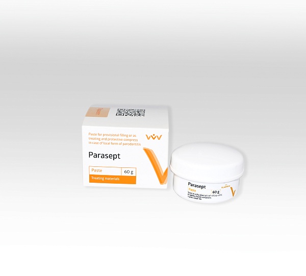 Pasta autoendurecible plástico "Parasept" que contiene fibras en la masa, preparado sobre la base de cemento de fosfato de zinc no contiene eugenol, tiene propiedades antibacterianas y antiinflamatorias.